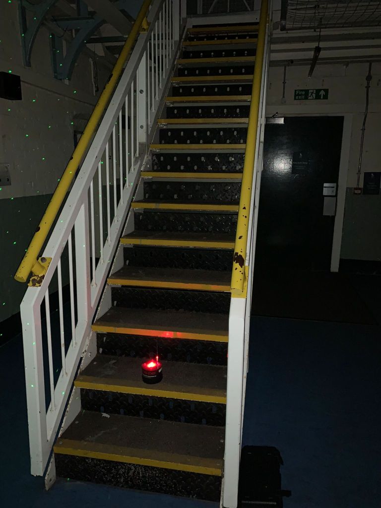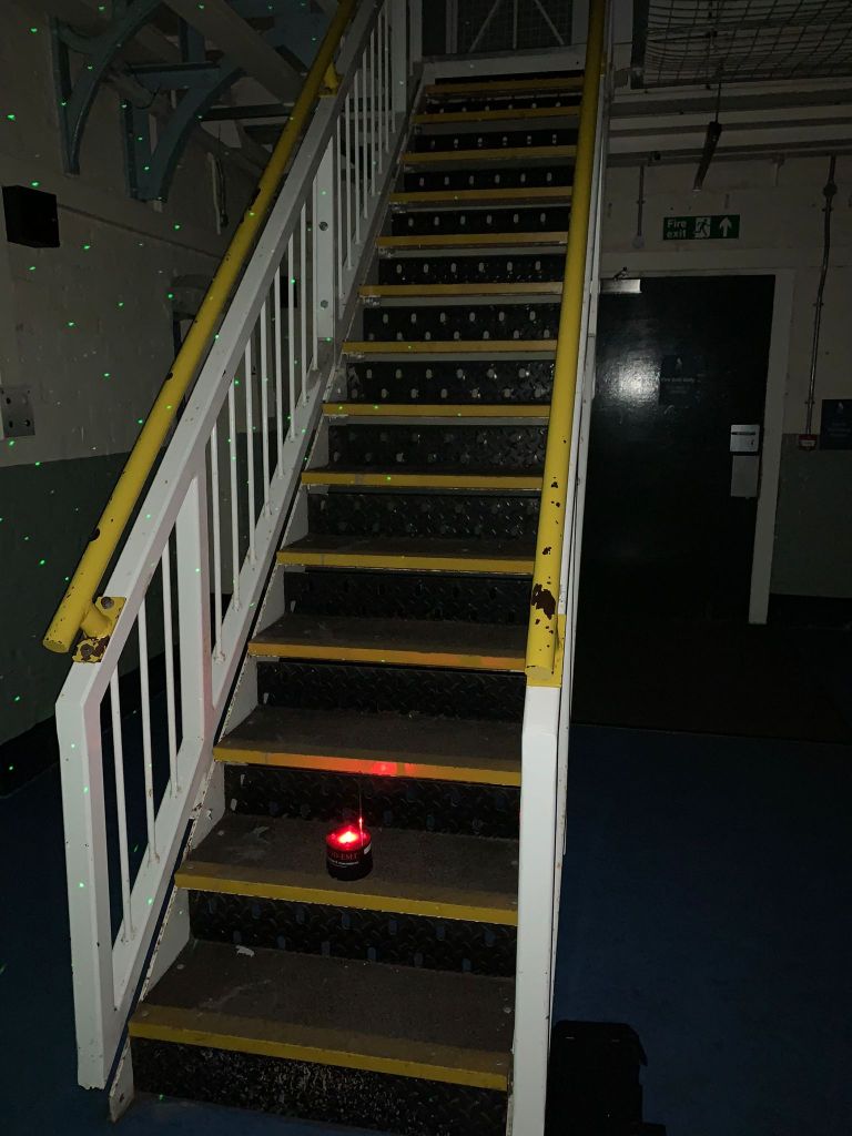 After calming down a little after that experience, we returned to the laser pen. I asked again for the spirit to walk down the stairs, and as we all looked, we saw some of the green dots start to go out in a sequence like it was mapping footsteps going up the stairs. It continued for a while. I told everyone to take photos of this, and sure enough, in one photo, I captured a picture of the stairs where all the green dots had disappeared. So, who was on the stairs? We continued to watch as the lights started going out up and down the stairs. The best way I can explain it is someone pacing up and down a set of stairs. The spirit talking to us on the board confirmed it was someone walking up and down the stairs when we asked. Then the REM POD triggered on the other side of us about fifty metres along the cell block. That took our attention away from the stairs, and now our questions focused on discovering who that spirit was. However, we didn’t find out who this was as we had run out of time on this session. There was still another area left to investigate tonight, but I don’t see how anything could be as good as what we had just experienced. How wrong was I!